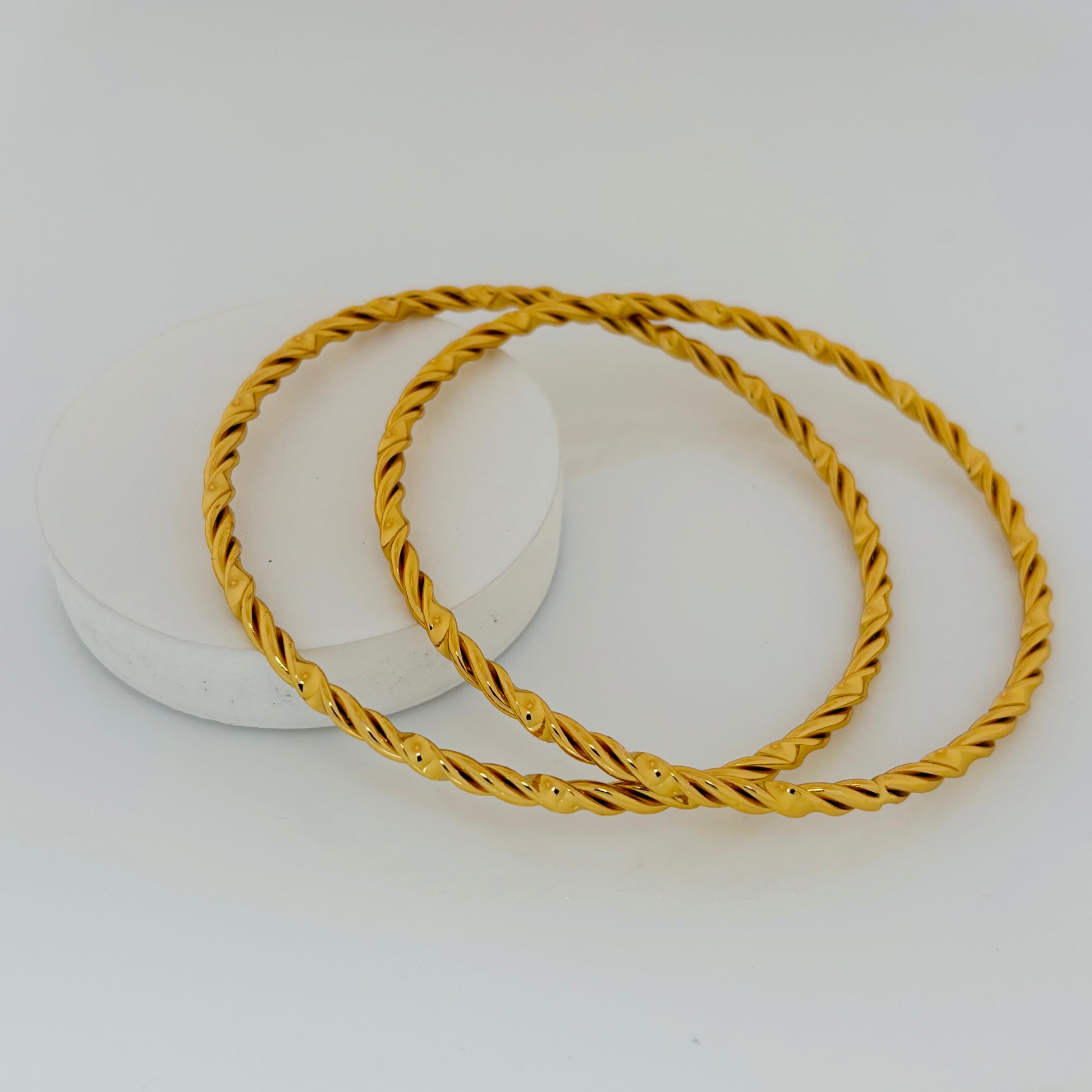 This Malli bangle boasts a twisted design and is expertly crafted with anti-tarnish gold plating, making it perfect for regular wear. Made to fit size 2.8, this bangle offers both style and comfort. Elevate your jewelry collection with this timeless piece.